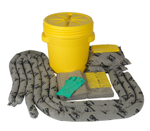 Bradyᆴ Allwikᆴ 20 gal Universal Drum Spill Kit with absorbency of 15.5 gal/bale is water and chemical resistant polyethylene lab kit. Kit contains 12- 15″ X 19″ pads, 3- 3″ X 12′ SOCs, 2- 18″ X 18″ pillows, 1- nitrile gloves, 3- disposal bags, goggles and emergency response handbook. Screw top kit meets UN specification and finds applications for small to medium response.