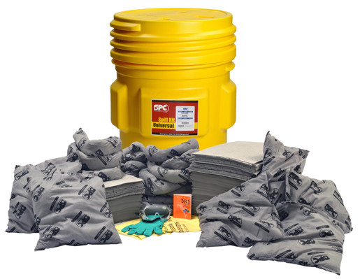 Bradyᆴ Allwikᆴ 65 gal Universal Drum Spill Kit is tough, secure, reusable and has absorbency of 63 gal/bale. Kit contains 100 pads, 7 Socs, 7 pillows, 1 pair gloves, 7 disposal bags, 1 pair goggles and emergency response handbook. Screw topped Kit is ideal for medium-large spill responses.
