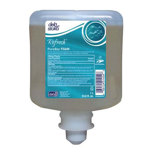 Deb Group Refresh™ PureBac Foam (1 liter refill) is a perfume-free and dye-free antibacterial foam hand was with Chloroxylenol (PCMX) to cleanse the skin and kill bacteria.