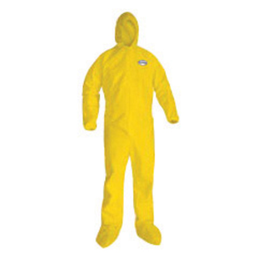 Kimberly-Clark Professional X-Large Yellow KleenGuardᆴ A70 Level B/C Chemical Protection Coverall comes with bound seams, storm flap over front zipper closure, elastic wrists, hood and boots. It features 1.5 mil polyethylene film coated spun bond polypropylene fabric with liquid resistant and patented Reflexᆴ design which is 7-1/2 times less likely to rip out than ANSI minimums and provides 12% more chest room and 6% longer body length. Coverall includes a wick away lining for enhanced comfort, softer and quieter fabric. It is made with NFPA 99 compliant antistatic material and is applicable in hazardous waste remediation, environmental cleanup, petrochemical/oil refining, acid/caustic handling, biohazard cleanup, tank cleaning and pharmaceutical manufacturing.