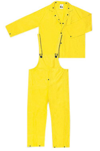 The Wizard Series Material offers a .28mm double coating of PVC with tough nylon scrim material layered in between. The Nylon Scrim has excellent rip and puncture resistance. This material has also been treated to have a limited Flammability quality, tested in accordance with ASTM D-6413. The 3003 yellow three pc suit that features a jacket with hood and bib style pants. The jacket offers a storm fly front with snaps, take up snaps at the wrists, and a detachable hood with drawstring. Bib pants feature a fly front with snap and take up snaps at the waist and ankles.