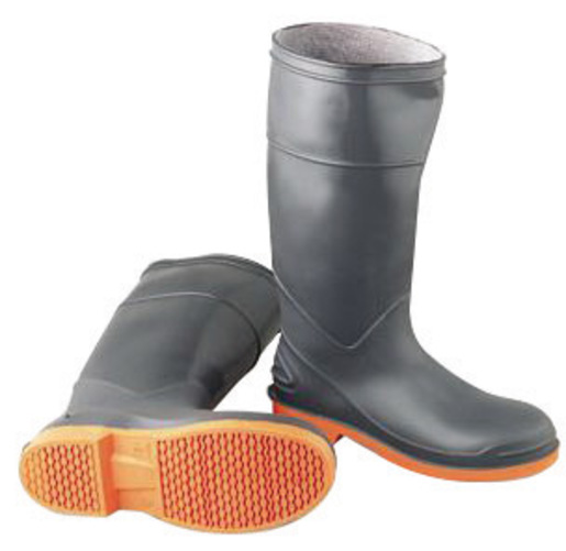 Onguard SureFlexル Grey/Orange Size 10 PVC Knee Boots with safety-loc outsole and steel toe feature PVC/nitrile sole along with a PVC compound upper. The outsole prevents slipping and the steel shank provides firm arch support. The 100% waterproof Boots resist chemicals, abrasion, animal fats, petroleum, oils, grease and the kick off lugs promote easy removal. The comfort insoles can be removed and the boots are used in farming, food processing, chemical plants.
